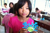 活動現(xiàn)場,孩子們盡情發(fā)揮自己的想象,用有限的廢紙、易拉罐等廢棄材料創(chuàng)造出了各種富有特色的手工藝作品。許多學生的創(chuàng)意作品超出了隊員們的想象,隊員們?nèi)滩蛔∨氖纸泻。雷州市烏石?zhèn)三教小學六年級學生用日常可見的易拉罐瓶設(shè)計出簡易的小垃圾桶。將平凡的垃圾桶擬人化,還在設(shè)計出來的垃圾桶上寫著“保護環(huán)境、愛護家園”等標語。二年級學生設(shè)計出的綠色太陽花,說那是一朵綠花,那是一個希望。