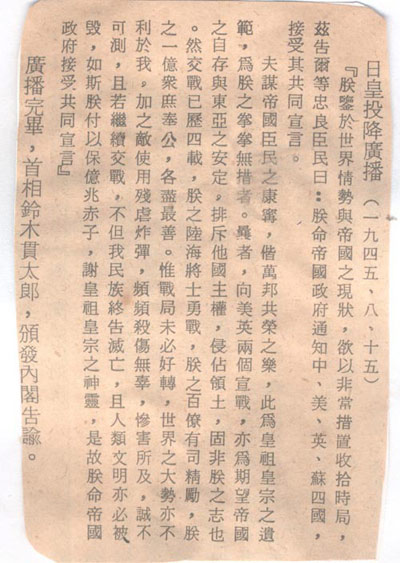 1945年8月15日日本天皇投降廣播詞。這篇文告是告訴自己的老百姓(忠良臣民)的。其中對于發(fā)動戰(zhàn)爭的罪責(zé)不但沒有一個字的自責(zé),而且指“敵使用殘虐炸彈,頻頻殺傷無辜,慘害所及,誠不可測!焙褪嗄旰笏l(fā)現(xiàn)的東條英機(jī)遺囑的惡劣態(tài)度如出一轍。廣大網(wǎng)友不放回頭看看2013年12月12日18:21:31《歷史鐵證日本400年侵華野心,讓我們恨搗靖國神社內(nèi)幕吧!》一文中東條英機(jī)的遺囑。