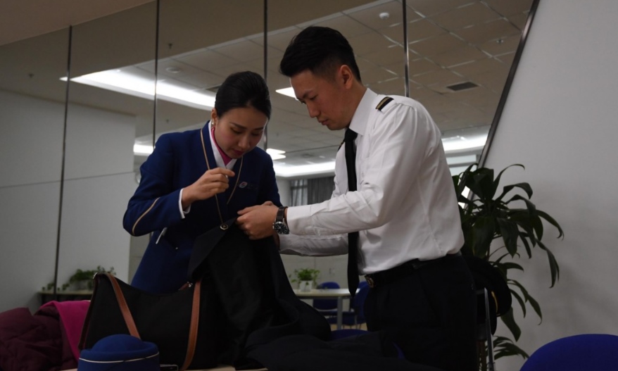 春運(yùn)期間,劉黎(航空安全員)與妻子練黎(乘務(wù)長)一同堅(jiān)守崗位。(新華社)